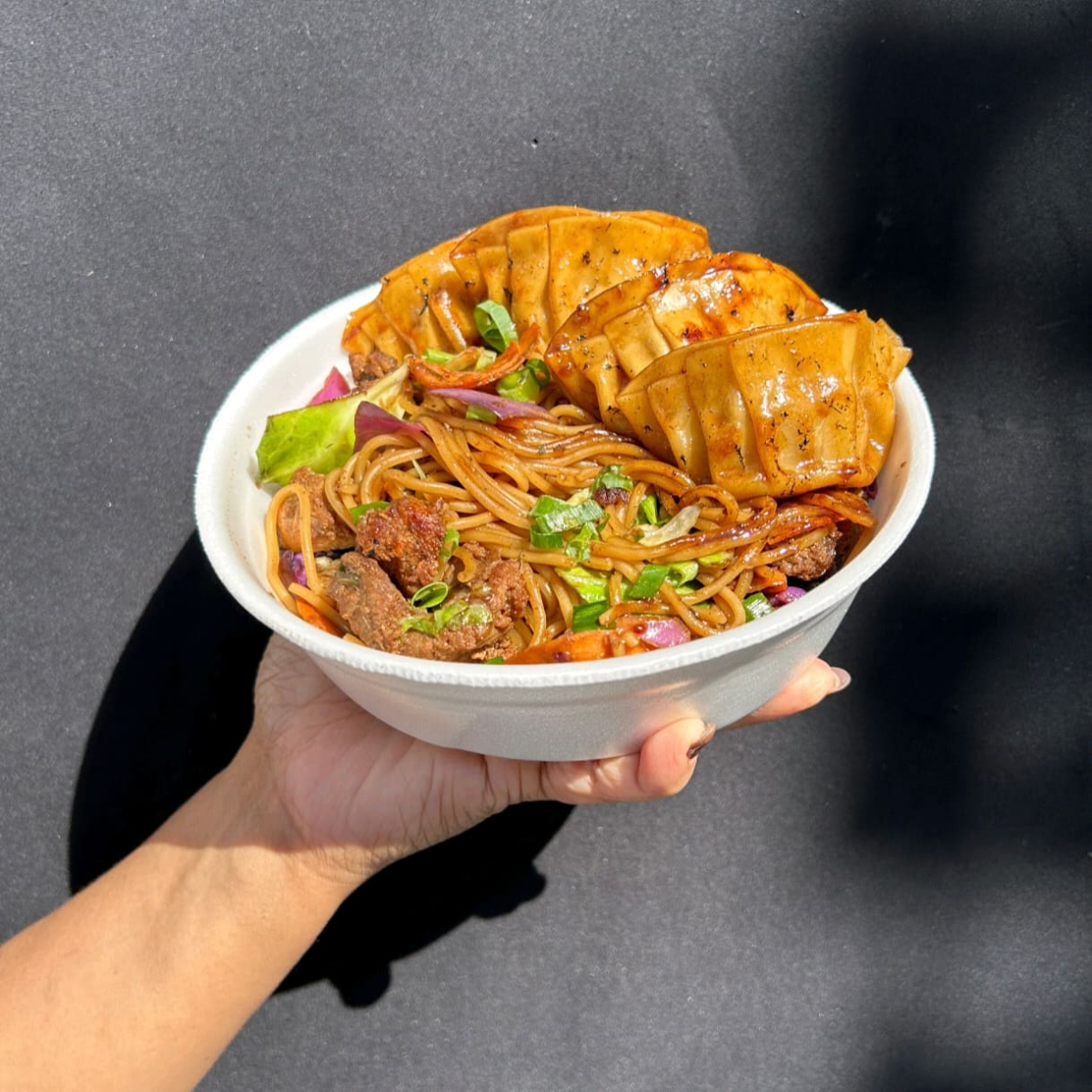 (NÃO ACOMPANHA MOLHOS) - Ideal para compartilhar bons momentos com muito sabor oriental! 500g de yakisoba misto (frango ou misto - carne e frango) com legumes frescos e molho exclusivo da casa + 2 guiozas crocantes e recheadas artesanalmente. Uma experiência completa!
