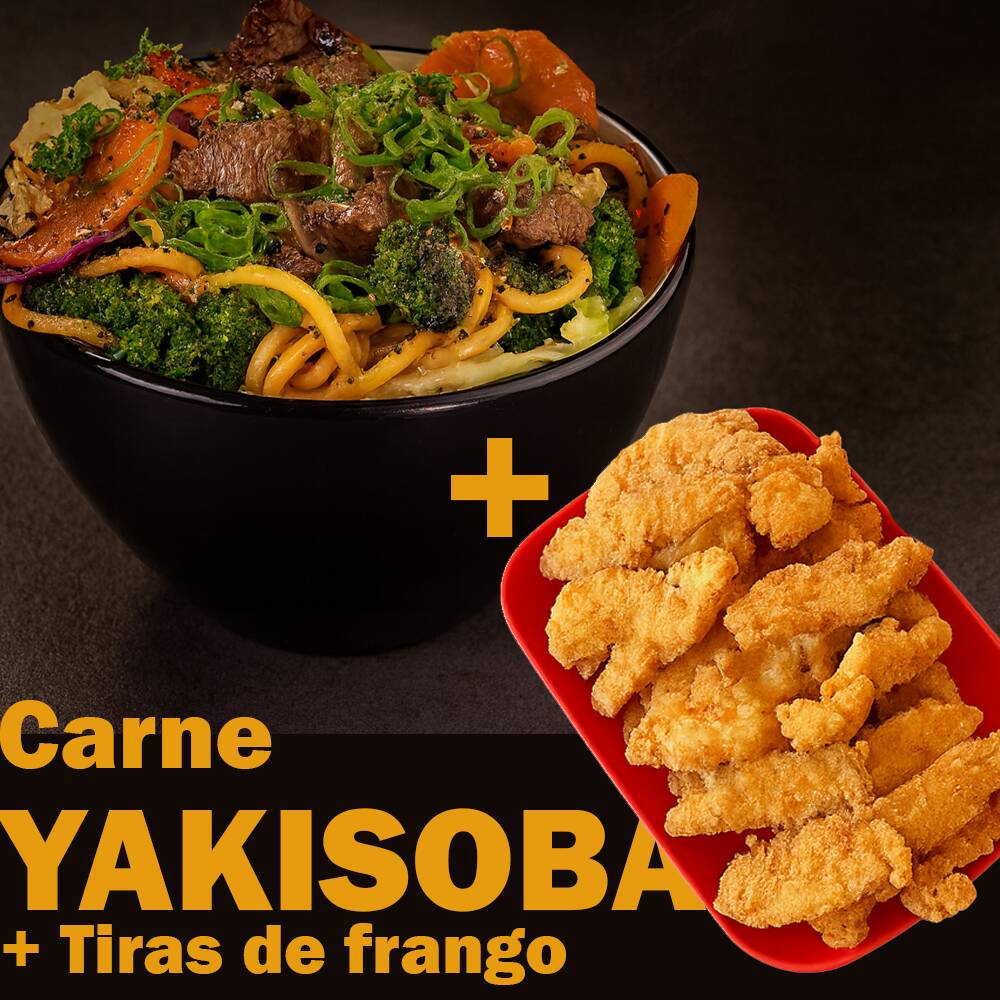 (NÃO ACOMPANHA MOLHOS) - Uma combinação deliciosa para quem ama sabor! Escolha entre yakisoba de frango ou misto (frango + bovino) e acompanhe com 4 filés de peito de frango empanados, super crocantes. Finalize com o molho de sua preferência: agridoce ou orange. Um combo completo para sua refeição!