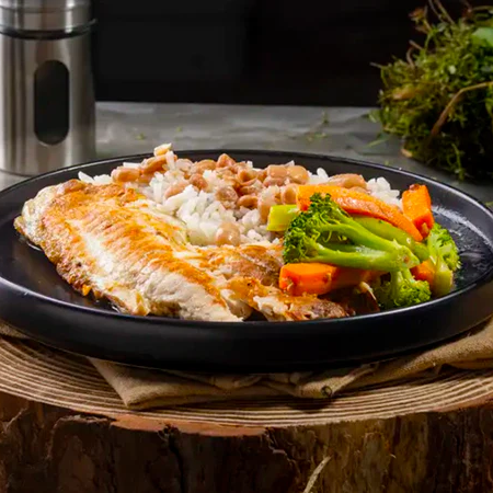 Marmitex arroz , filé frango grelhado feijão e salada
