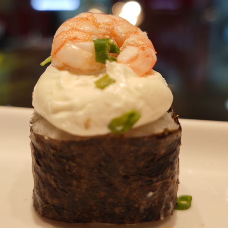 Enrolados de arroz em alga recheados com patê de salmão, cream cheese e cebolinha. Decorado com cream cheese e camarão (1 unidade)