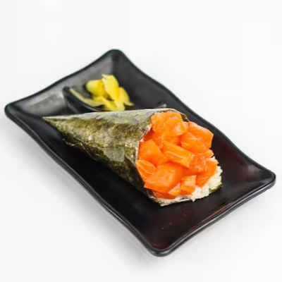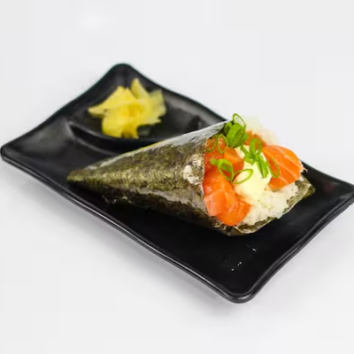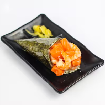 Enrolado de alga com formato de cone, recheado com salmão, camarão cozido, arroz, cebolinha e cream cheese.