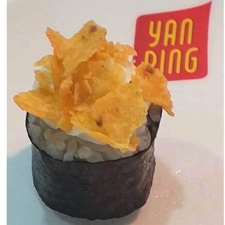 Enrolados de arroz em alga recheados com patê de salmão, cream cheese e cebolinha. Decorado com cream cheese e doritos (1 unidade)
