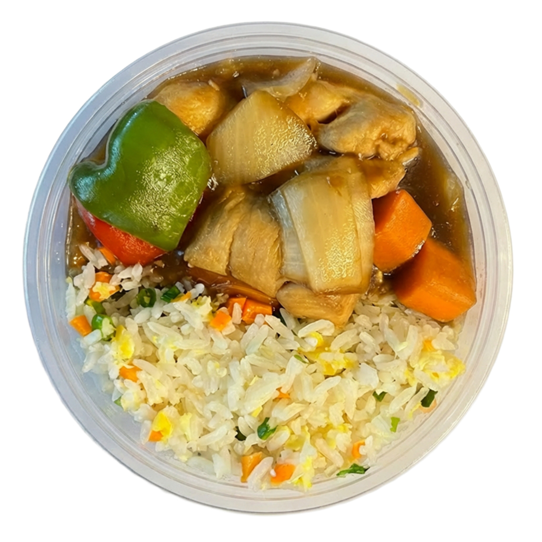 Arroz chop-suey refogado com flocos de ovos, cubinhos de cenoura e cebolinha. Peito de frango, pimentão verde, pimentão vermelho, pimentão amarelo, cebola e cenoura ao molho à base de shoyu