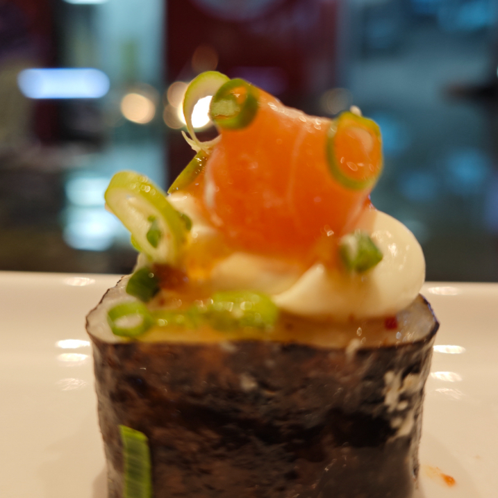 Enrolados de arroz em alga recheados com patê de salmão, cream cheese e cebolinha. Decorado com cream cheese, salmão flambado com molho especial da casa (1 unidade)