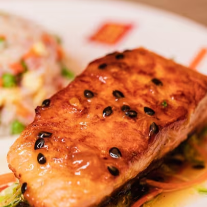 200 gramas de Salmão grelhado com molho de maracujá acompanhado de arroz chop suey.