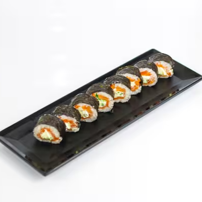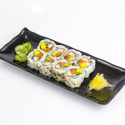 Enrolado de alga por dentro com arroz e gergelim por fora recheados com salmão, kani, pepino, manga e cream cheese. 8 unidades