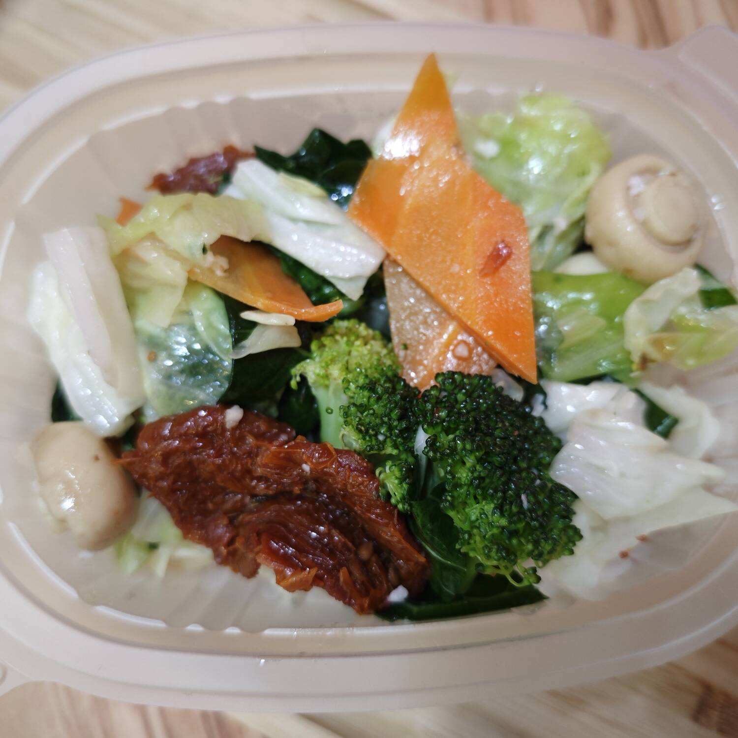 250g de legumes misto (brócolis, repolho, cenoura, champion, e tomate sêco) salteado ao alho e óleo.