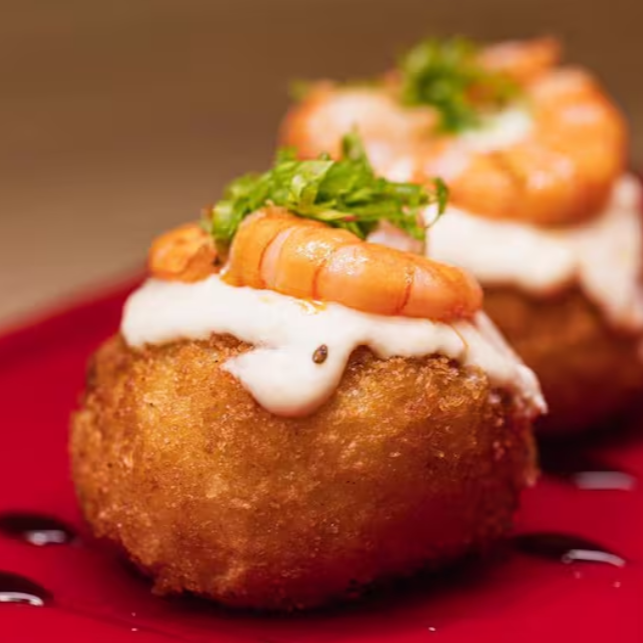 Bolinho de Salmão com recheio de cream cheese e camarão.