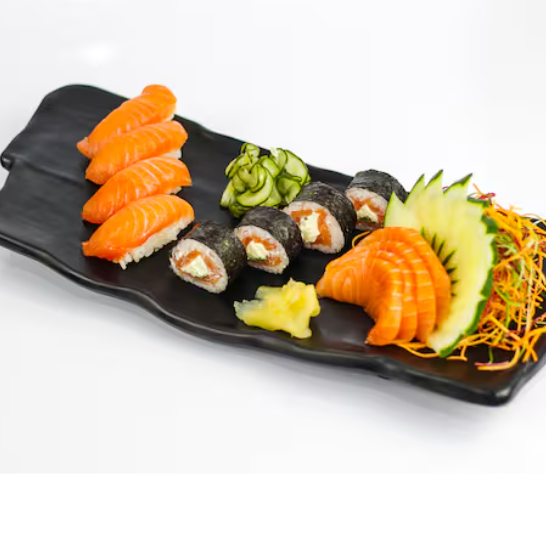 04 Niguiri de salmão, 04 Hossomaki filadélfia light e 04 Sashimi de salmão. *Nenhum item pode ser alterado! **