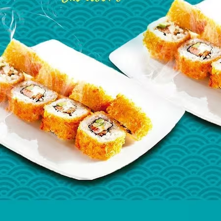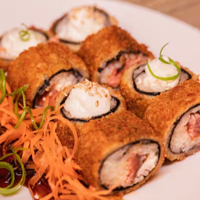 Makimono empanado com recheio de arroz, salmão, cream cheese e cebolinha.