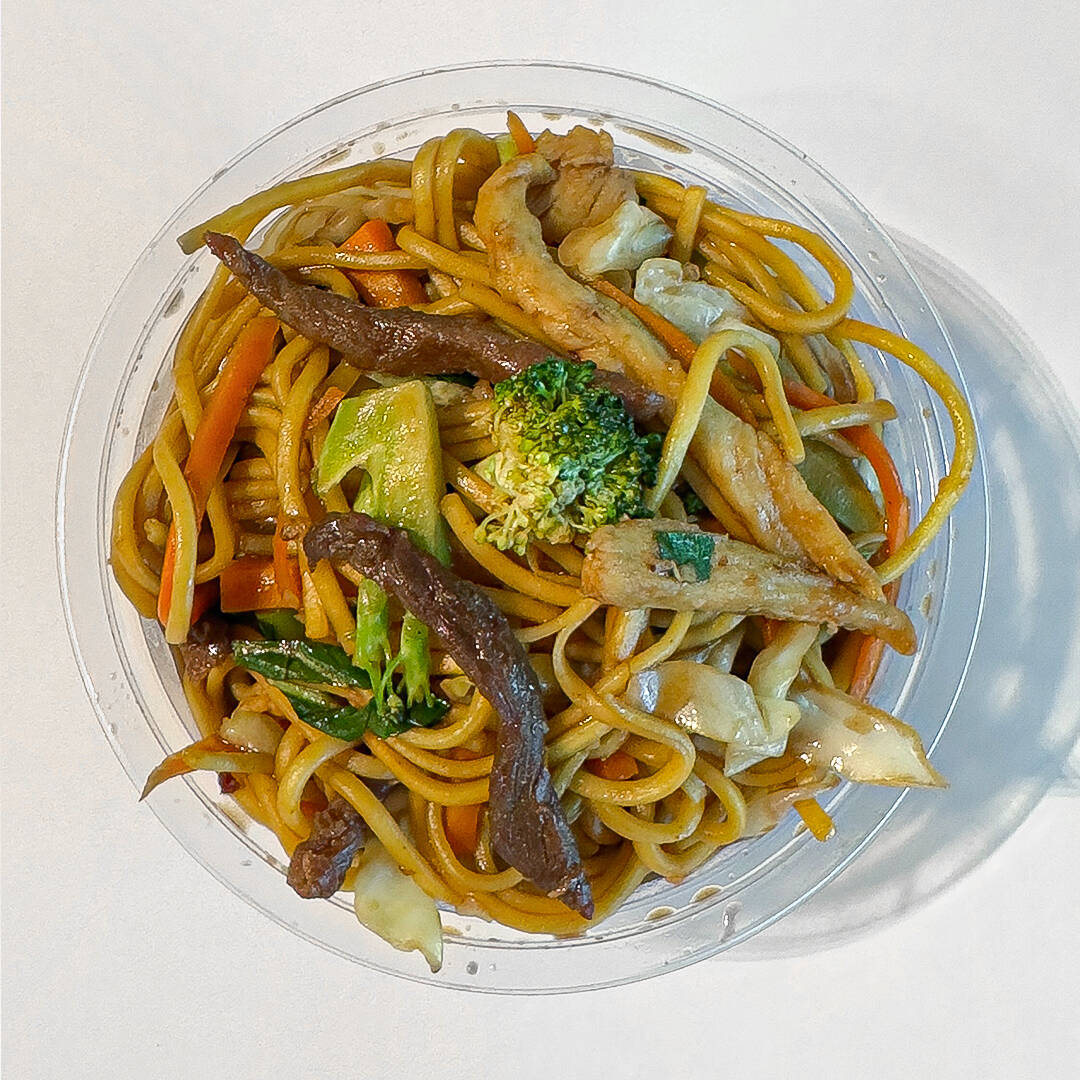 Yakisoba com legumes, frango e carne.