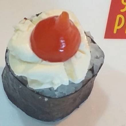 Enrolados de arroz em alga recheados com patê de salmão, cream cheese e cebolinha. Decorado com cream cheese e pimenta biquinho (1 unidade)
