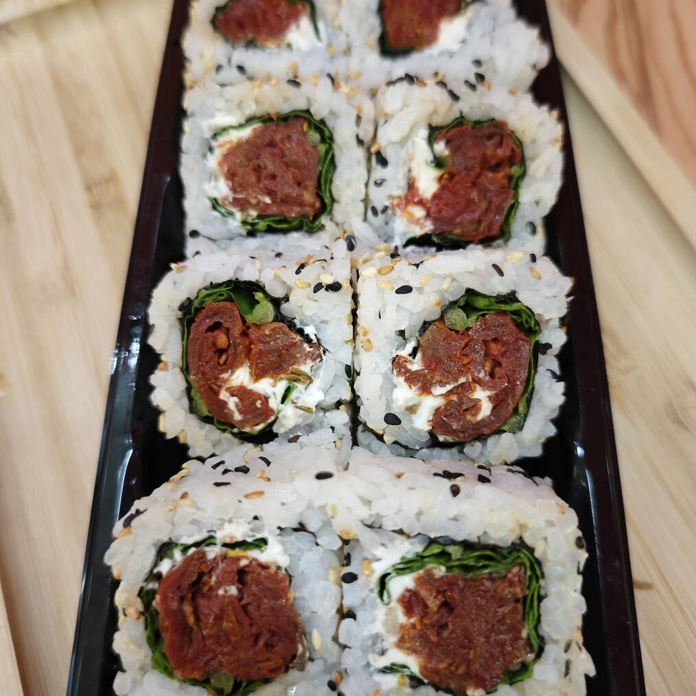 8 unidade de uramaki recheado com rúcula, tomate seco, e cream cheese.