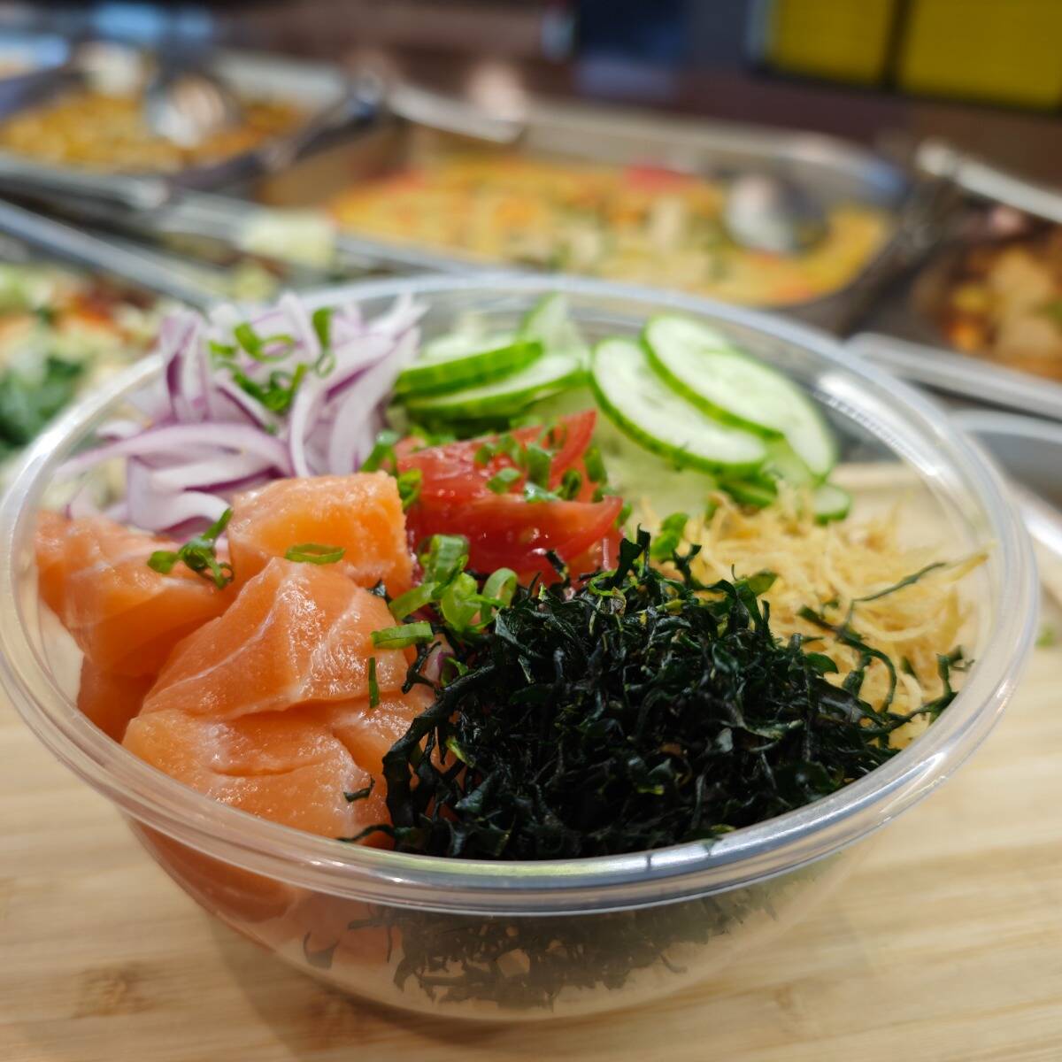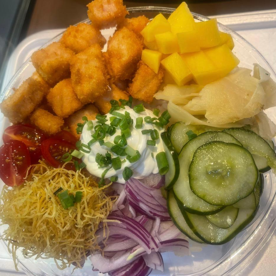Contém: arroz gohan, 70g de salmão em cubos, cebolinha, batata crispy, sunomono e tomate cereja. * Nenhum item poderá ser alterado, apenas poderá ser retirado.
