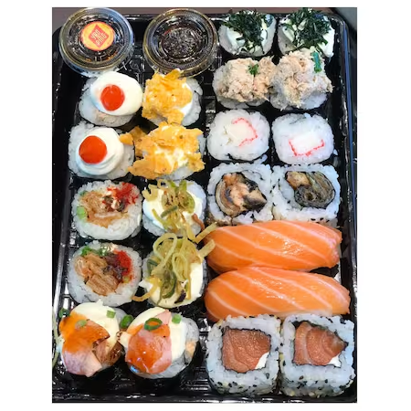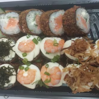 2 Niguiri de salmão , 2 Uramaki de salmão , 2 Uramaki de salmão skin, 2 Hossomaki de kani, 2 Hossomaki de pate de salmão , 2 Hossomaki de couve shake, 2 Hossomaki de salmão com molho especial, 2 Hossomaki de alho poro, 2 Hossomaki especial de salmão skin, 2 Hossomaki de Doritos, 2 Hossomaki de pimenta biquinho. *Nenhum item pode ser alterado! **