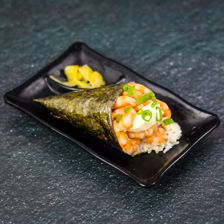 Enrolado de alga com formato de cone, recheado com arroz, camarão cozido, cebolinha, e cream cheese.