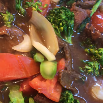 Combinação simples e saborosa de fatia de carne (patinho) com legumes servidos com nosso molho à base de shoyu acompanhado do arroz chop-suey.