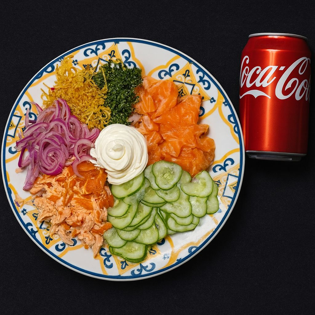 Nosso delicioso Poke do Chef, feito a base de arroz japonês, com salmão grelhado e salmão cru, batata crispy ,couve crispy, pepino, creme chesee e cebola roxa. Para completar, o refrigerante lata 350 Ml é por nossa conta.