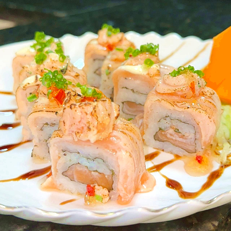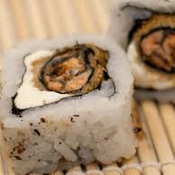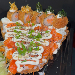 BASE DO PÃO : ARROZ JAPONÊS. RECHEADO DE SALMÃO EM CUBOS, CREME CHEESE , CEBOLINHA E BATATA CRISP