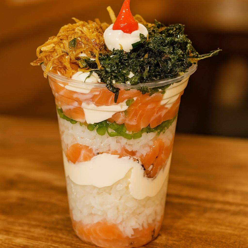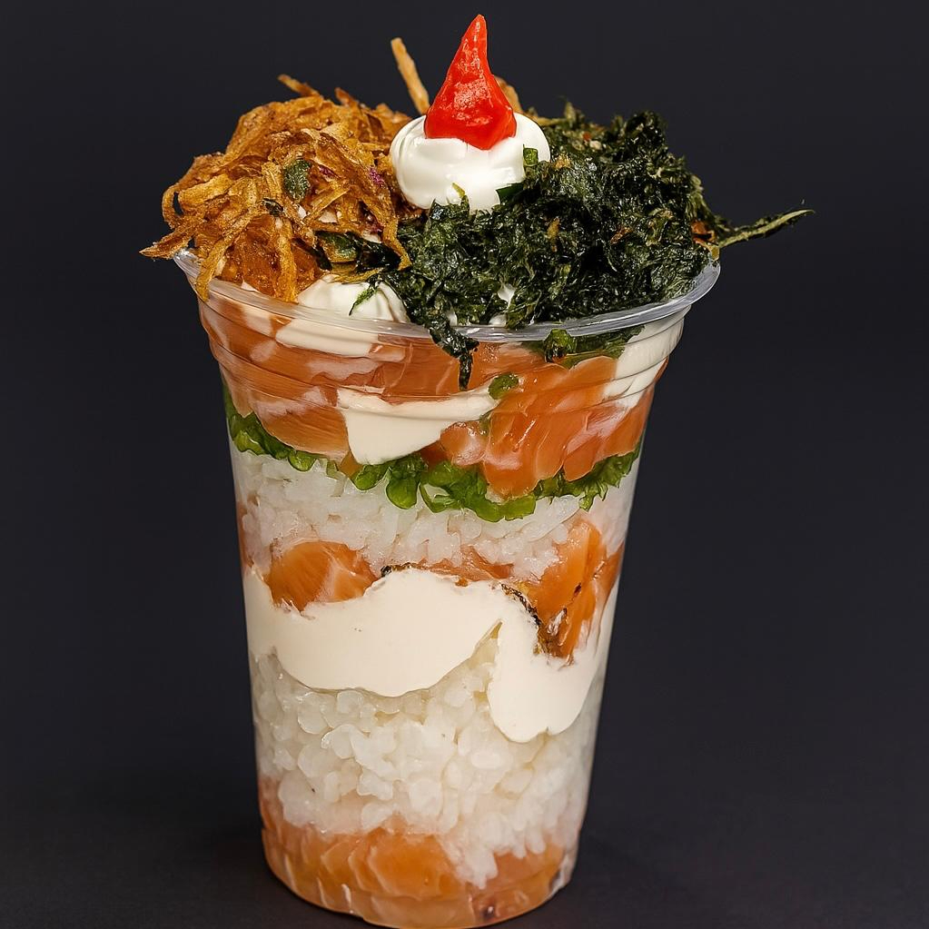 Copo de 250 Ml , recheado com arroz japonês , salmão em cubos, creme cheese, cebolinha, batata crisp e couve crisp.