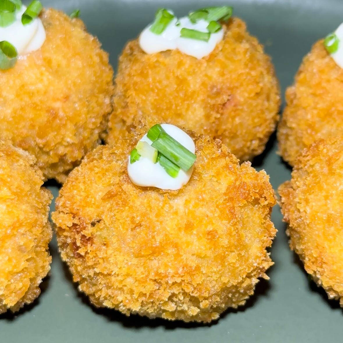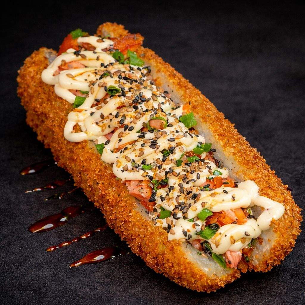 Arroz , salmão , creme chesee , cebolinha ! Empanado no panko e frito!
