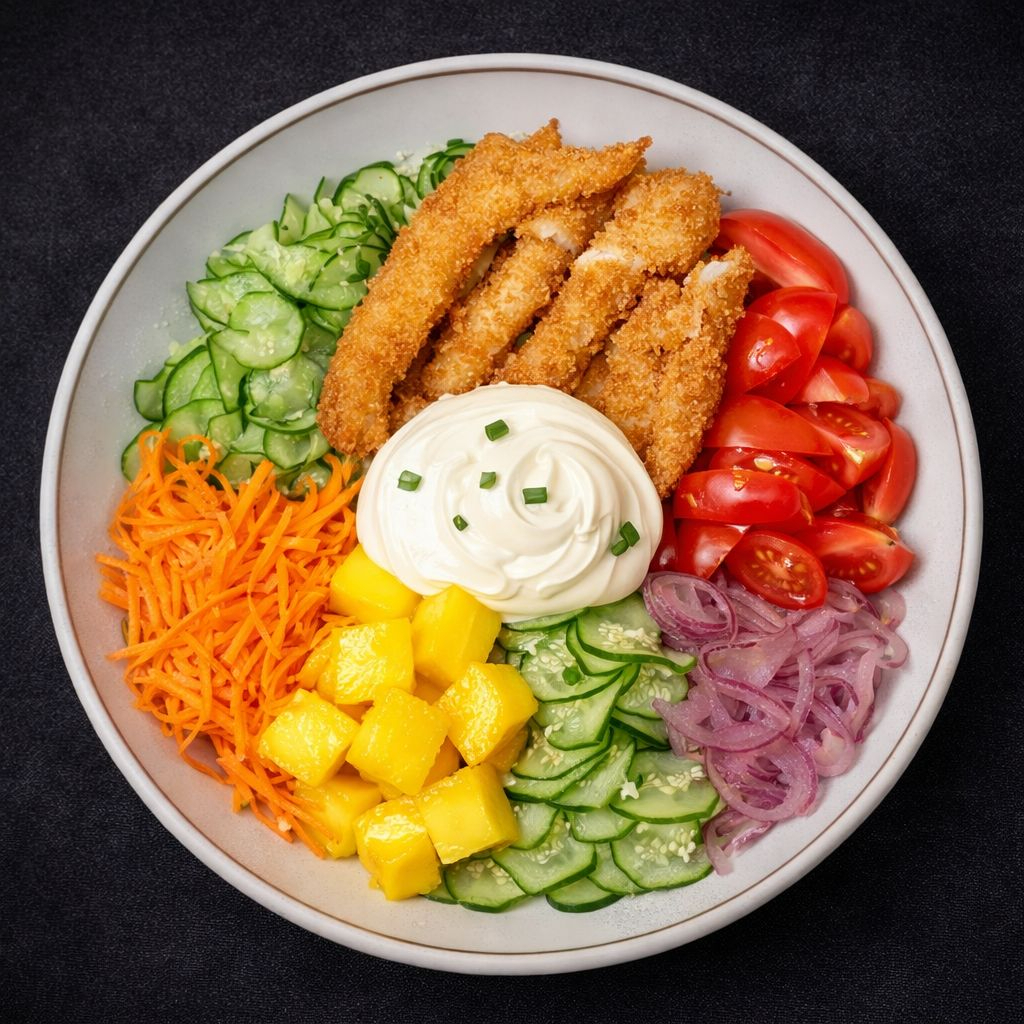TILAPIA EMPANADA , CENOURA RALADA, TOMATE CEREJA , PEPINO , CEBOLA ROXA , MANGA, ARROZ JAPONES E CREME CHEESE