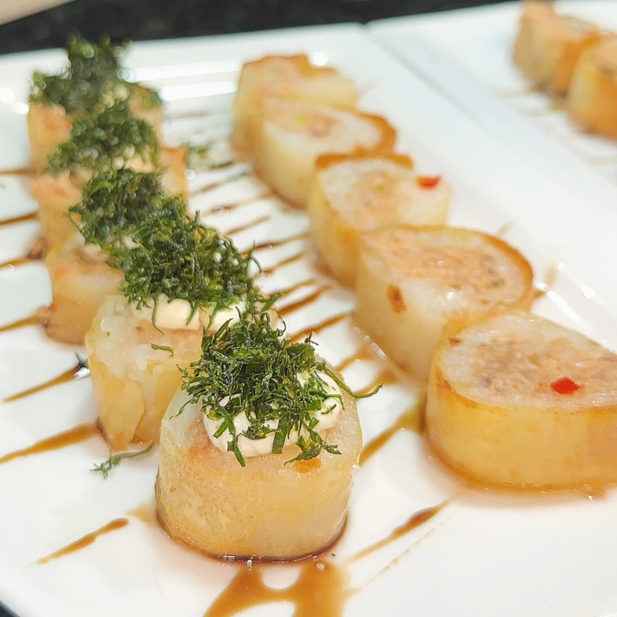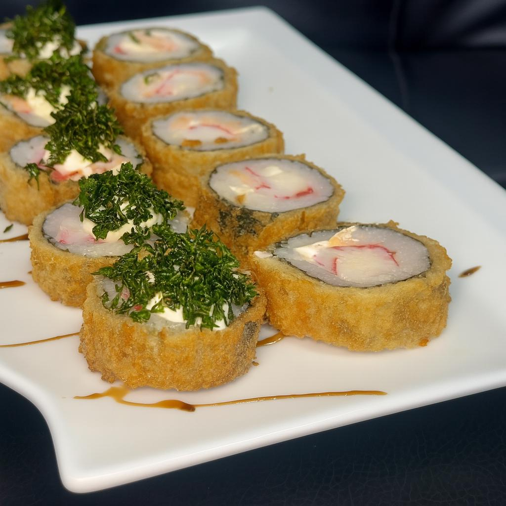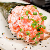 Alga empanada , com arroz japonês ,salmão em cubos, creme chesse . Escolha sua borda: Hot Philadelphia ou uramaki ou hossomaki