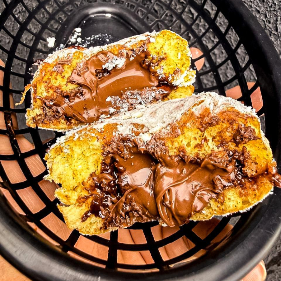Donut americano de massa frita, macio por dentro, recheado com Nutella e finalizado com açúcar de confeiteiro.