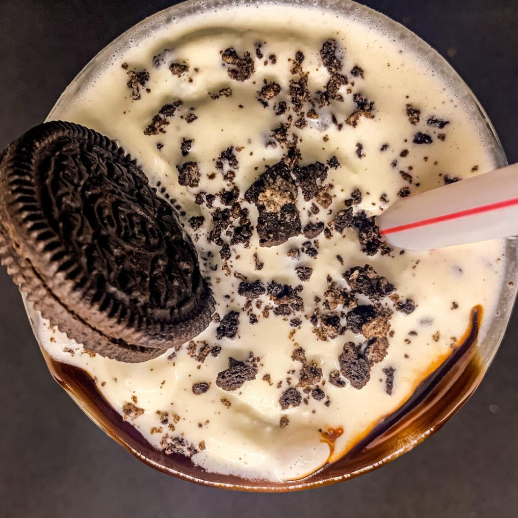Sorvete de baunilha + biscoito oreo + calda de chocolate