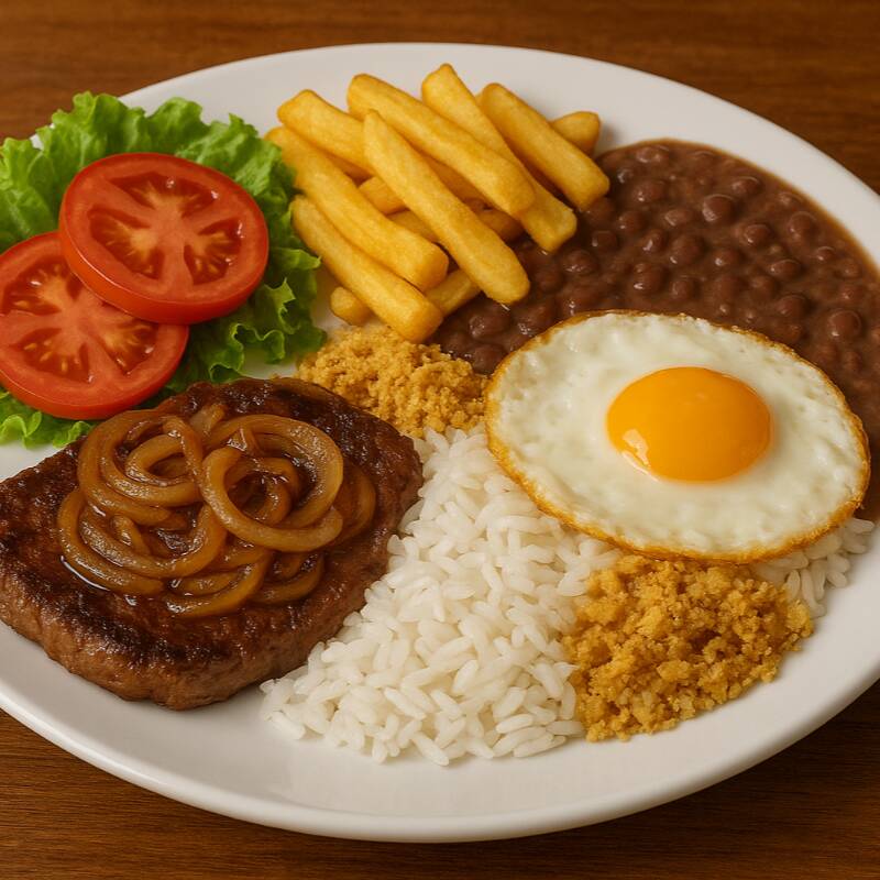 Acompanhamentos: Arroz Branco, Feijão de Caldo, Farofinha Acebolada e Salada do Dia.