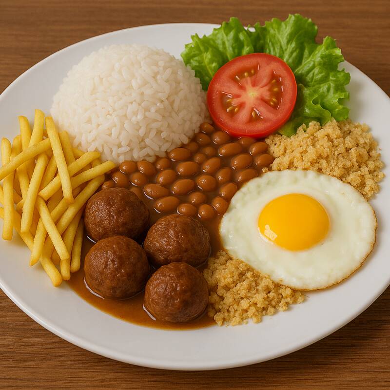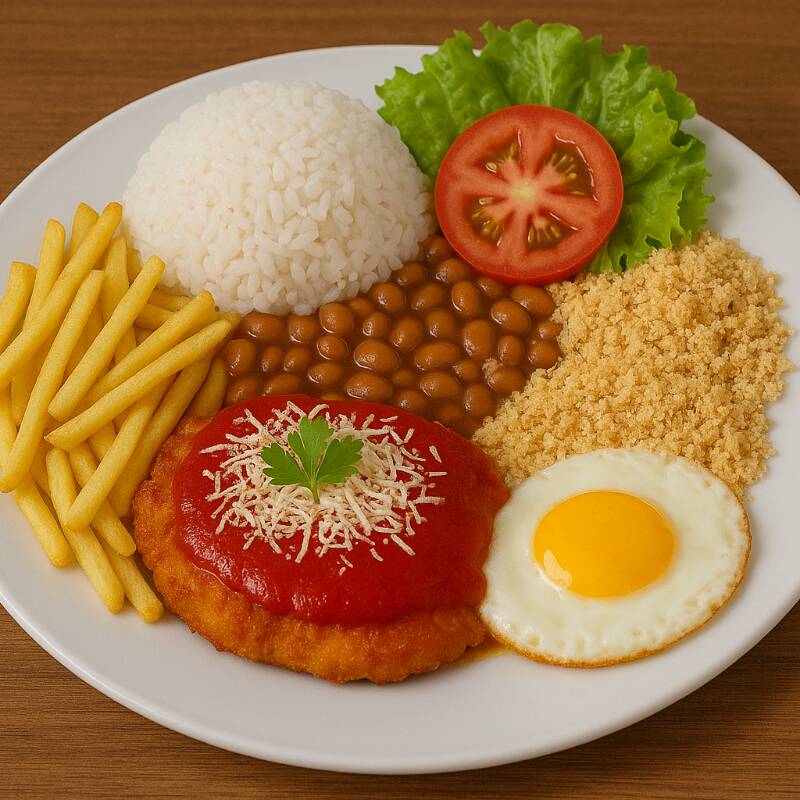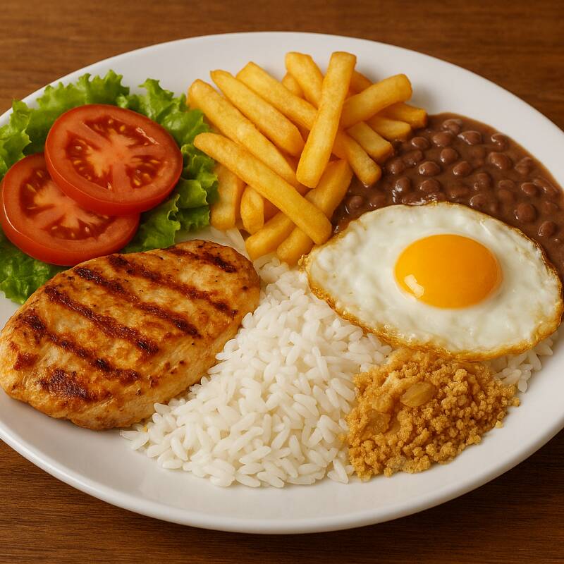 Acompanhamentos: Arroz Branco, Farofinha Acebolada e Salada do Dia.