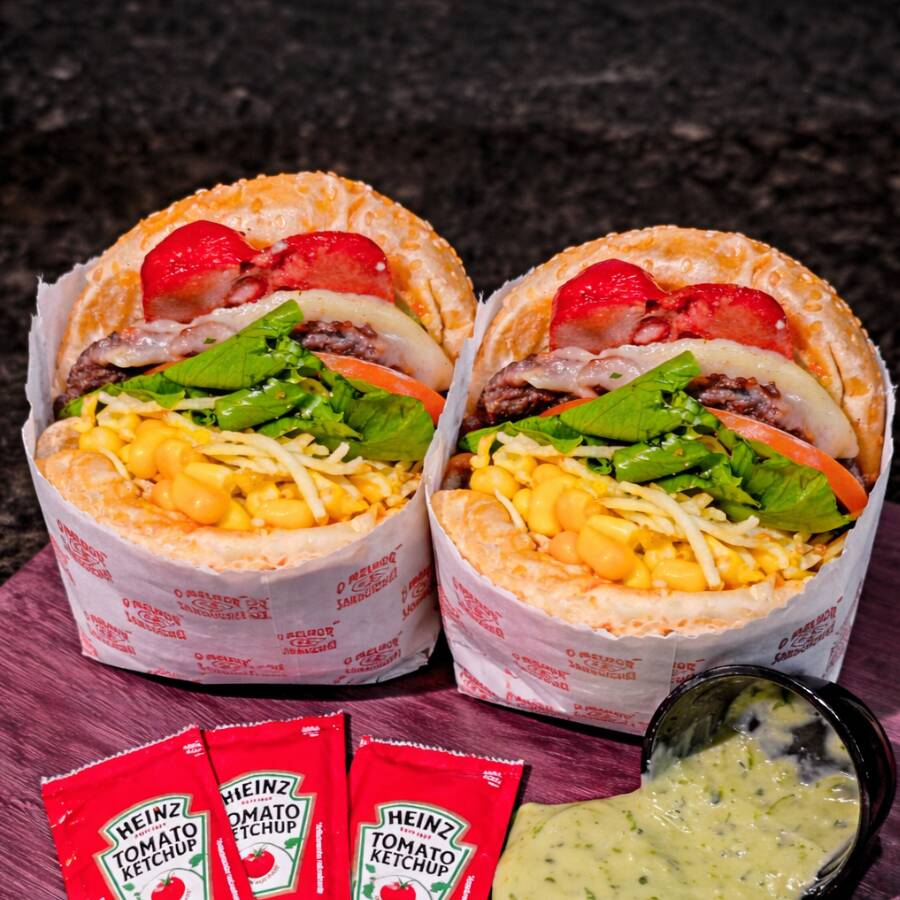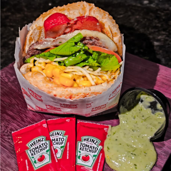 Carne Suculenta, Cheddar Cremoso, Ovo no Capricho, Milho Doce, Batata Palha Crocante, Alface e Tomate No Pão Macio Que Satisfaz!