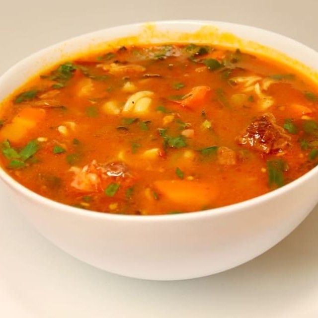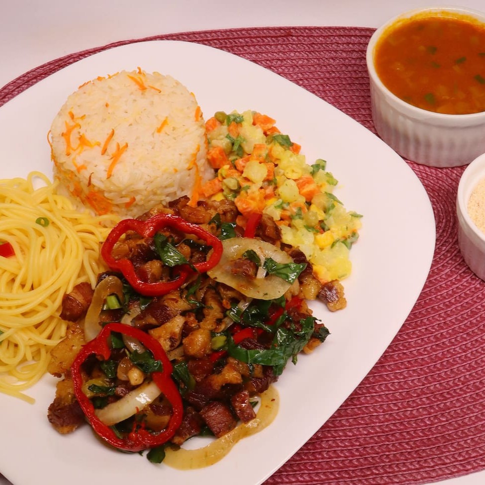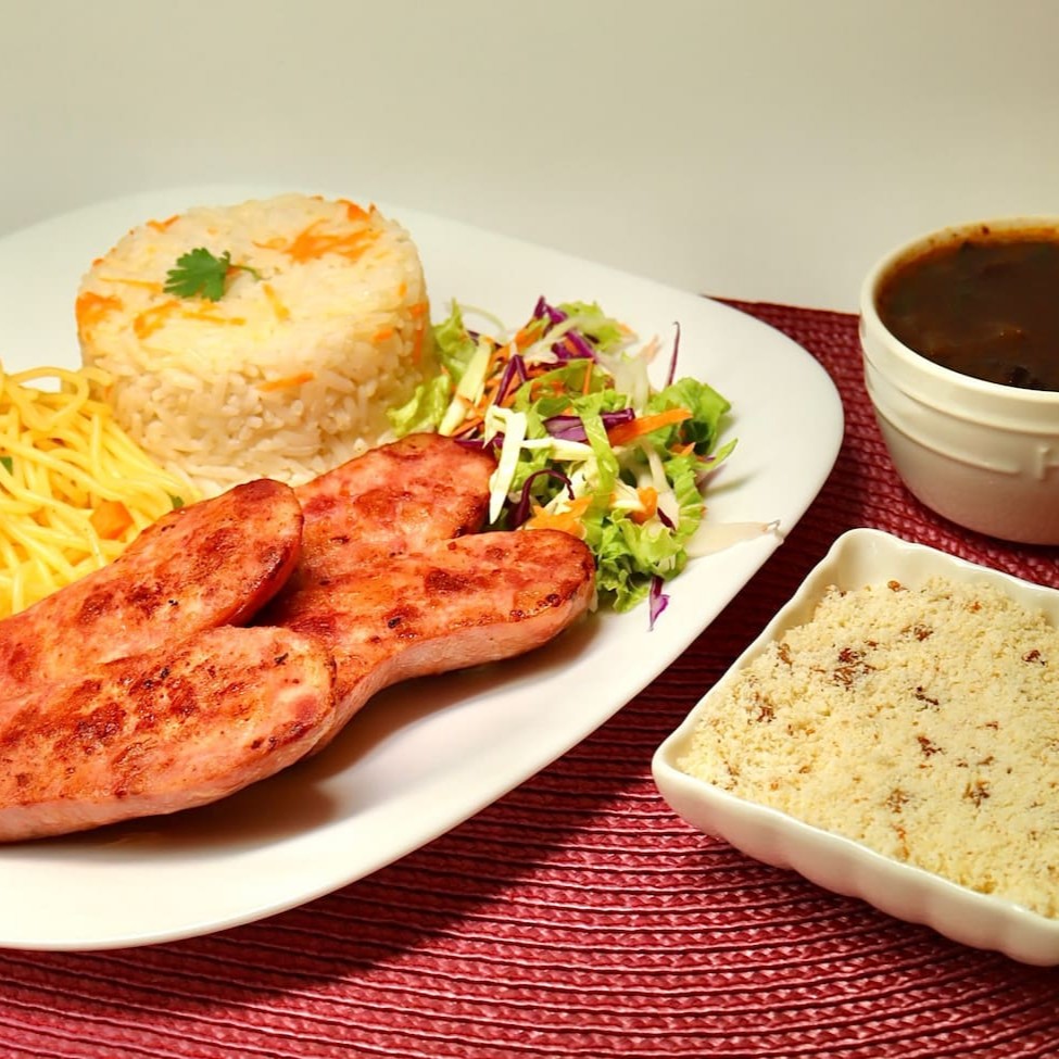 Deliciosa marmita de charque na chapa (180g), acompanhado de feijão, arroz, macarrão, salada e farofa.