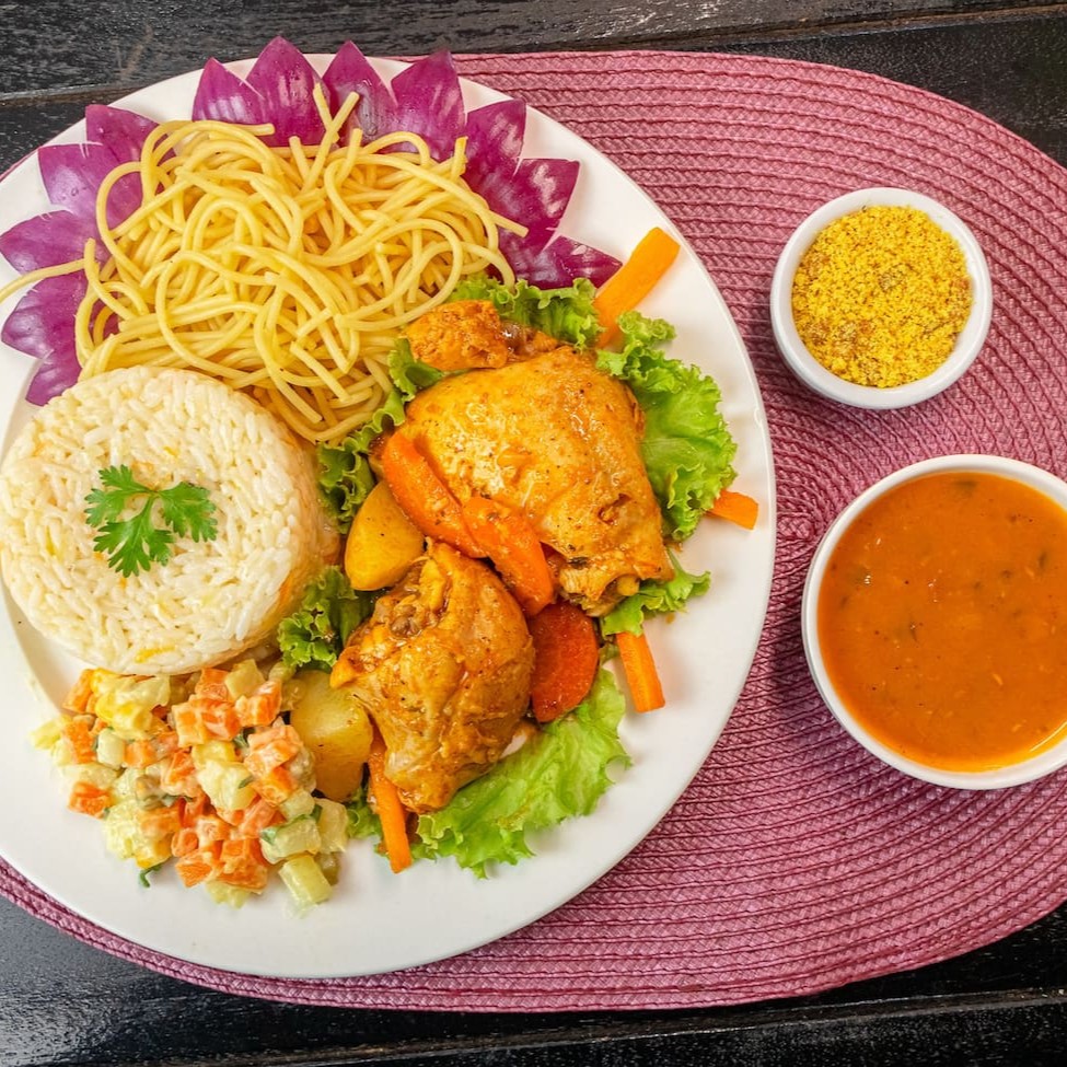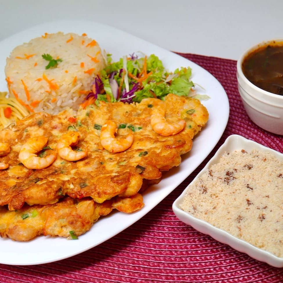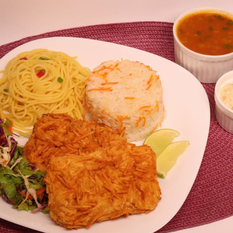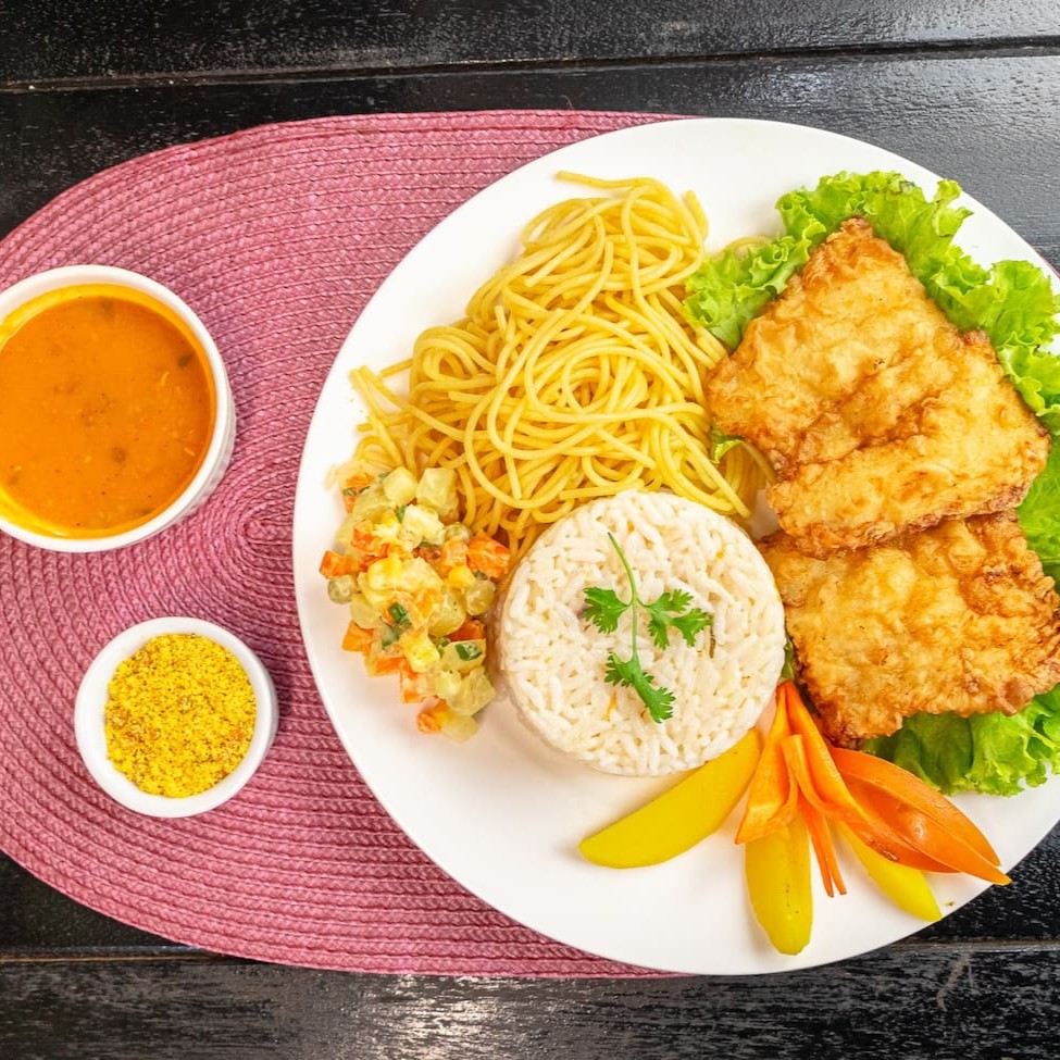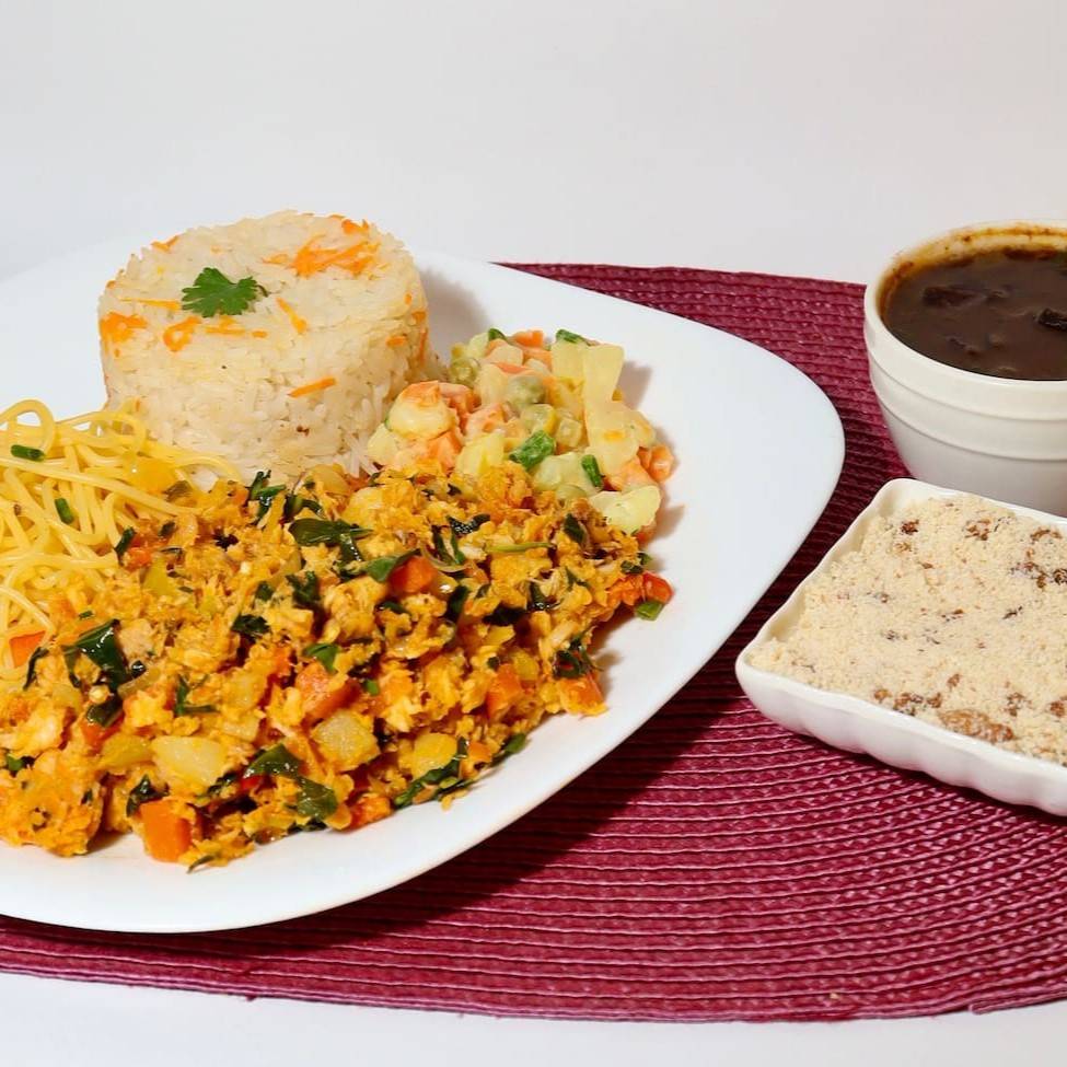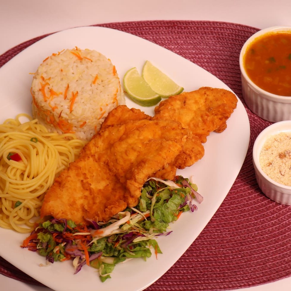 O prato se destaca por um suculento filé de frango empanado, crocante por fora e macio por dentro, acompanhado de um saboroso feijão temperado no ponto certo, arroz soltinho, macarrão saboroso e uma farofa crocante.