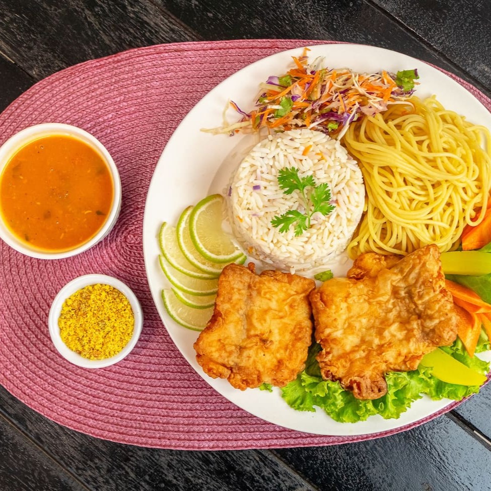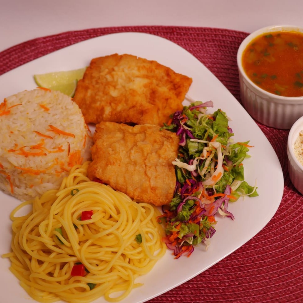 Deliciosa marmita de peixe frito pescada amarela (180g), acompanhado de feijão, arroz, macarrão, salada e farofa.