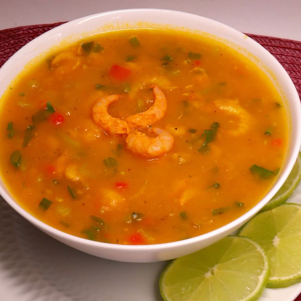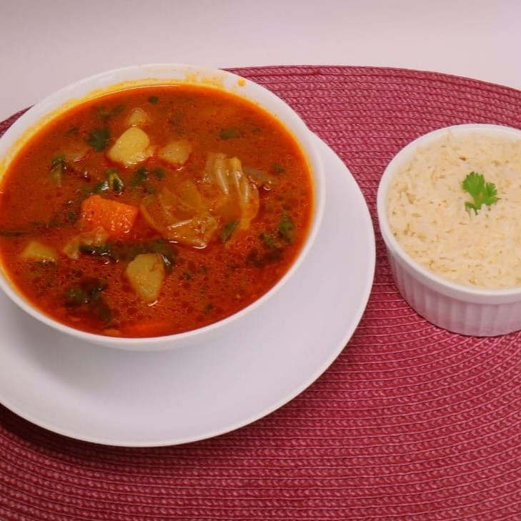 Delicioso cozidão de chambaril com legumes, acompanhado de arroz e farinha da região.
