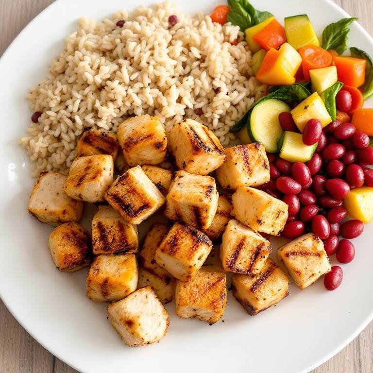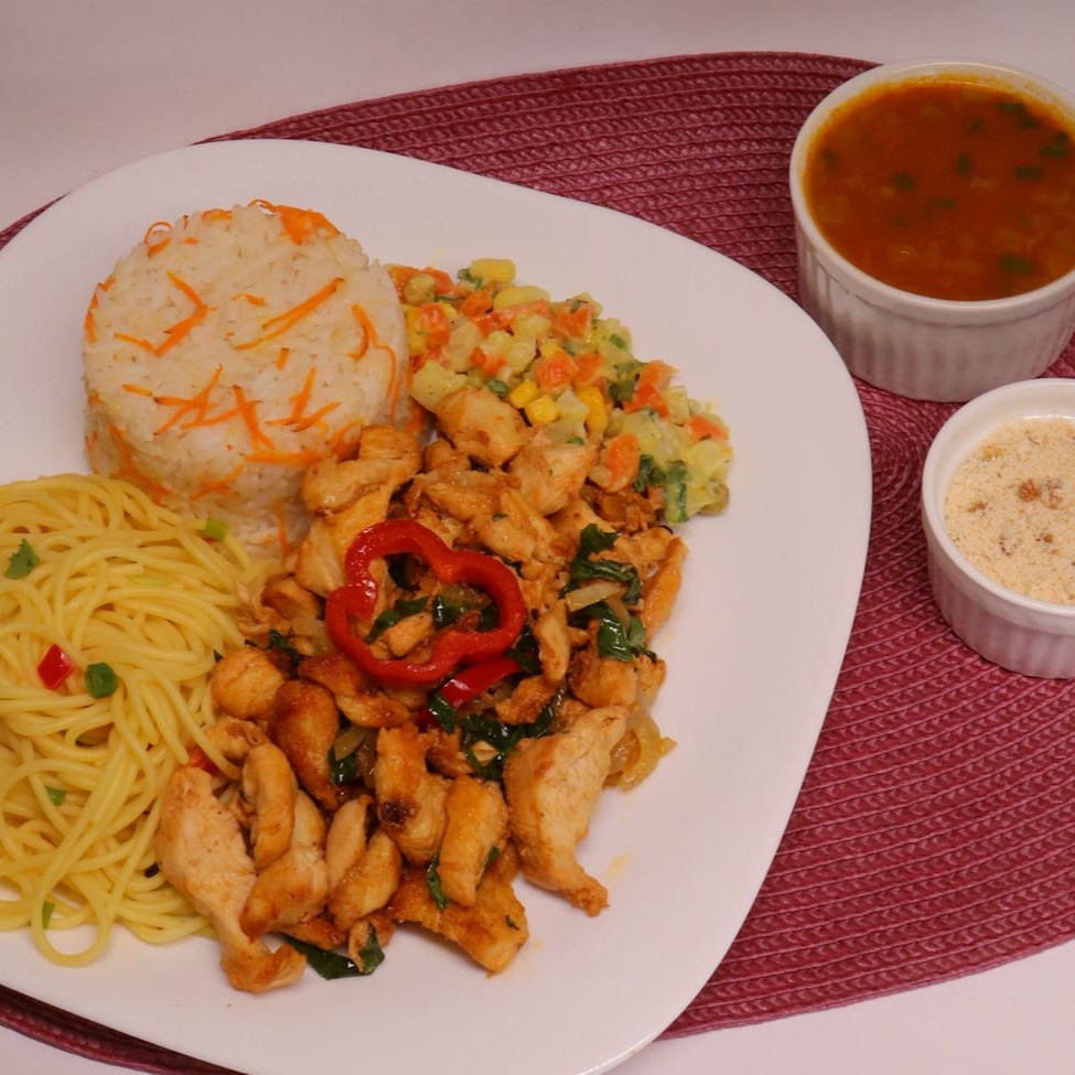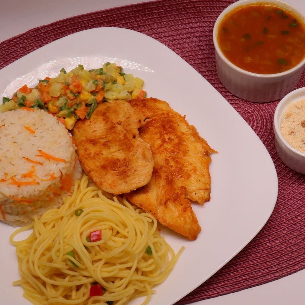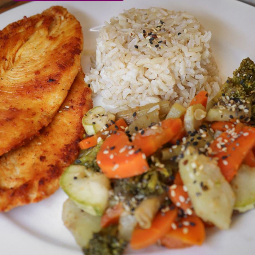Delicioso frango feito na chapa acompanhado de arroz integral, feijão e legumes.