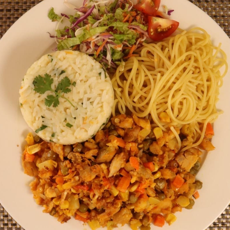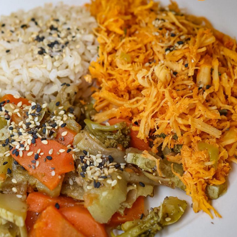 Delicioso frango desfiado acompanhado de arroz integral, feijão e legumes.