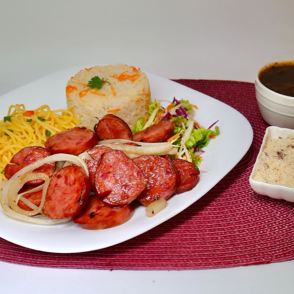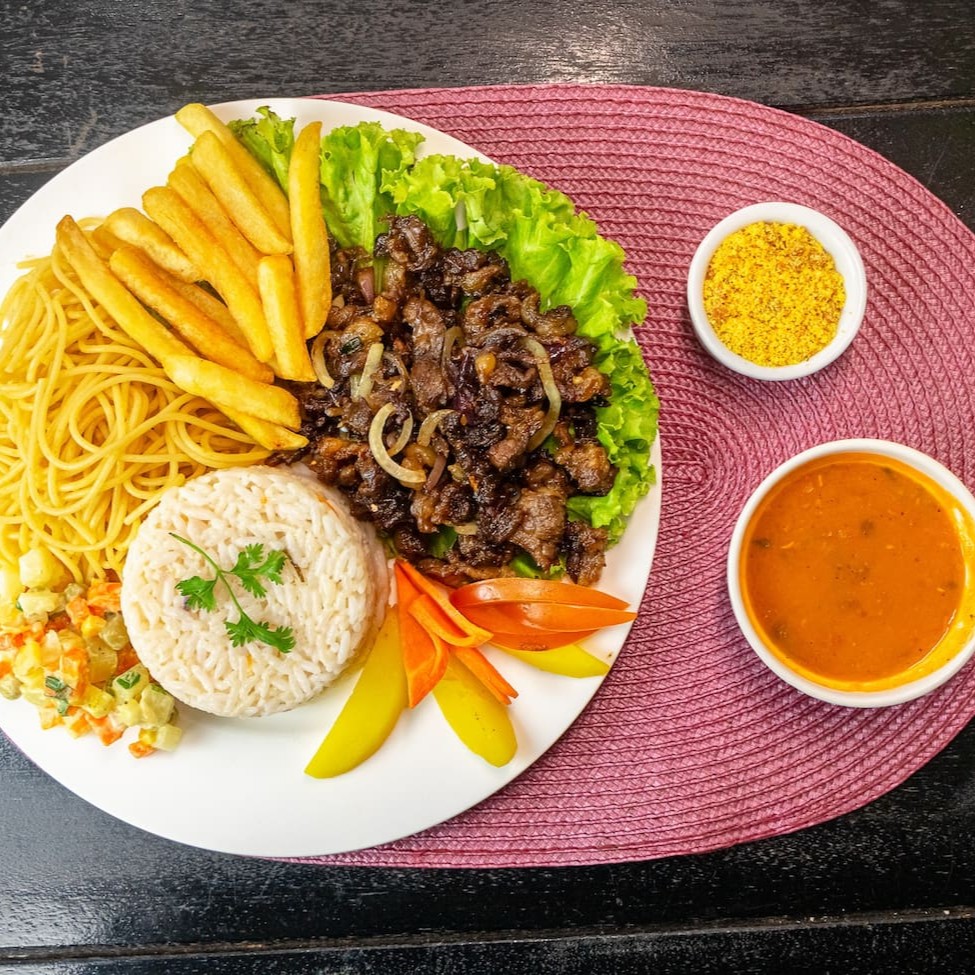 Suculentas iscas de carne, perfeitamente fritas e temperadas ao ponto. Acompanha batatas fritas, crocantes, um arroz branco soltinho, feijão fresquinho e uma farofa saborosa.