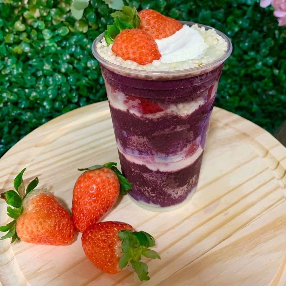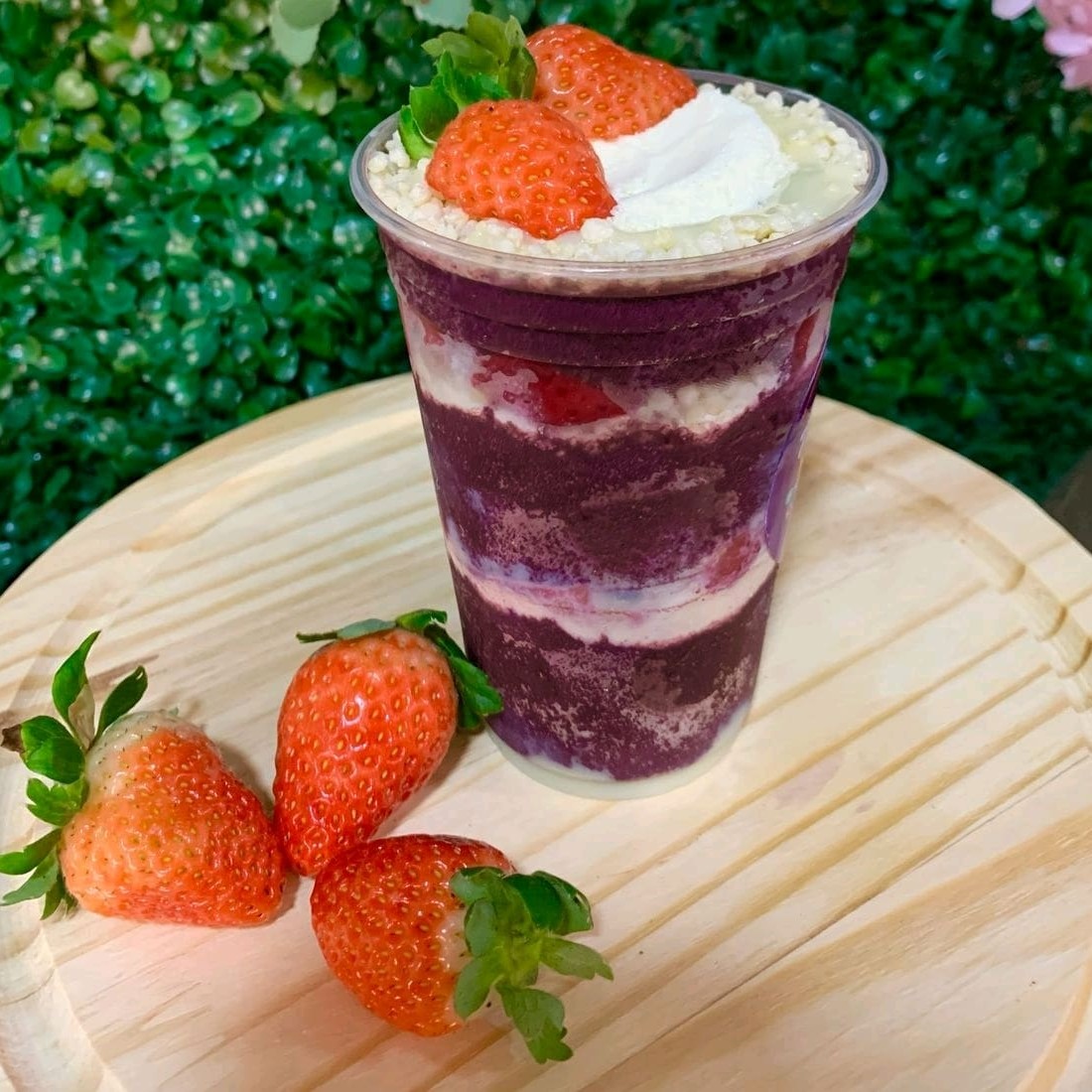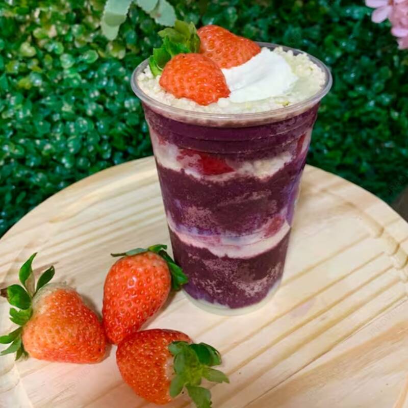 Na base temos uma camada de leite condensado, flocos de arroz, leite em pó e morango, por cima uma generosa camada de açaí cremoso. O copo é composto por três camadas dessa delícia.