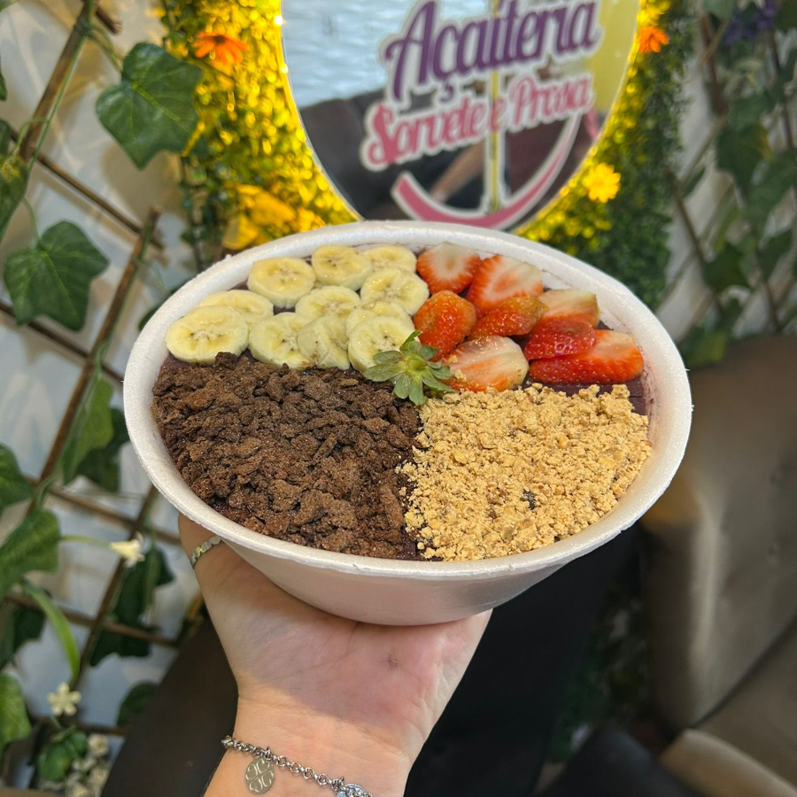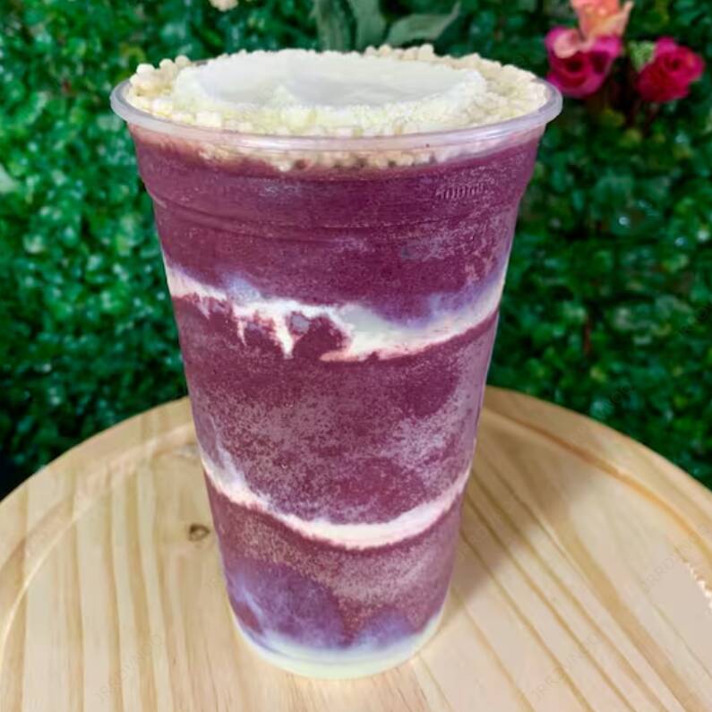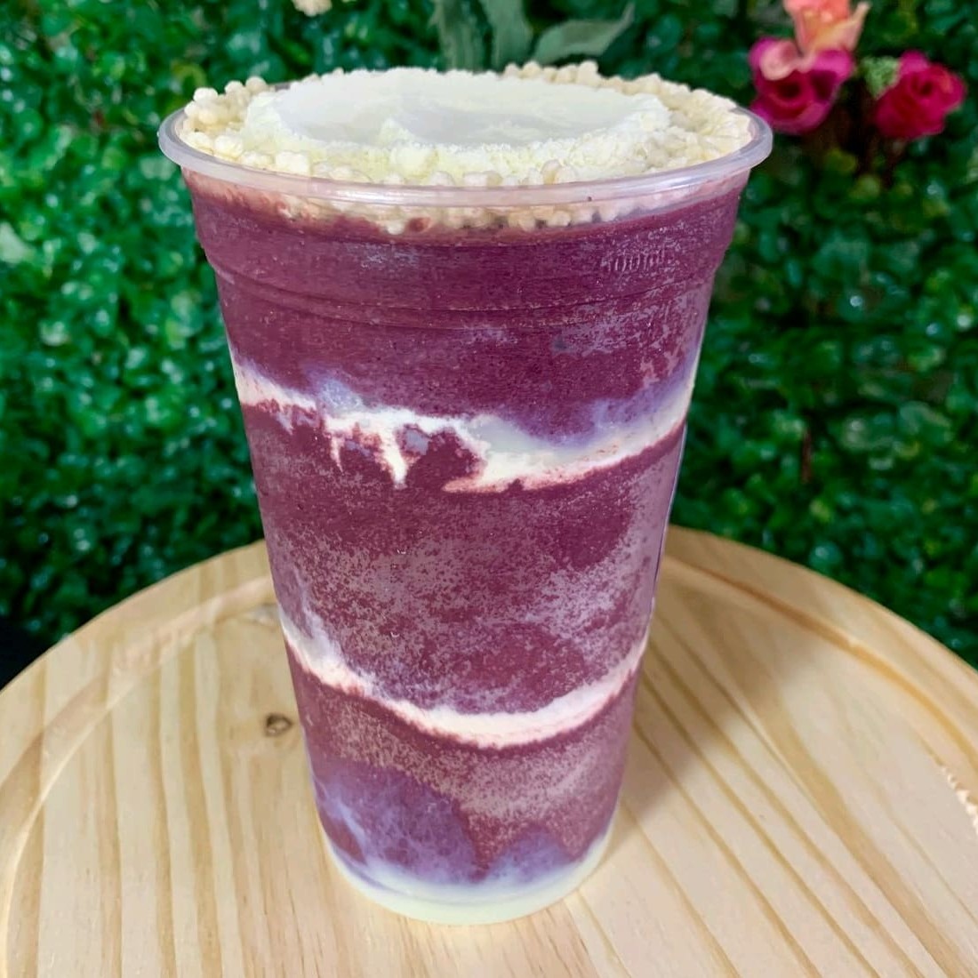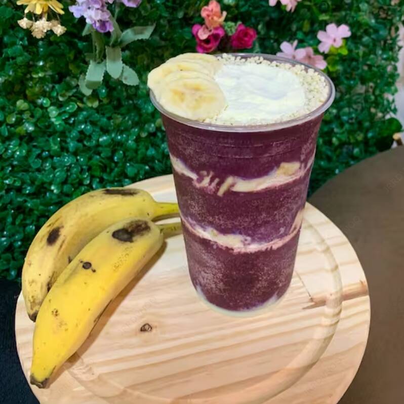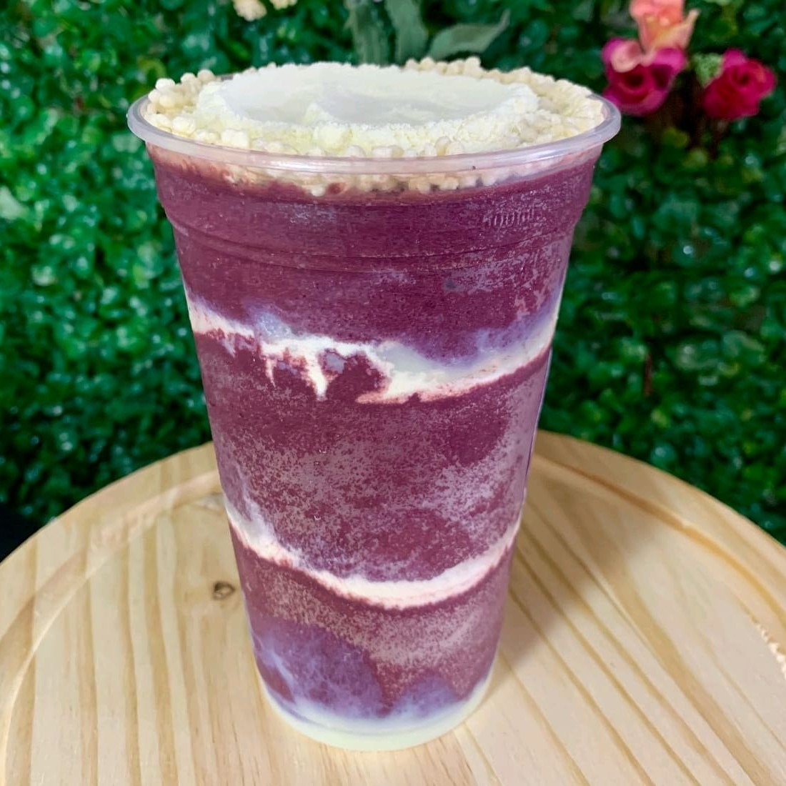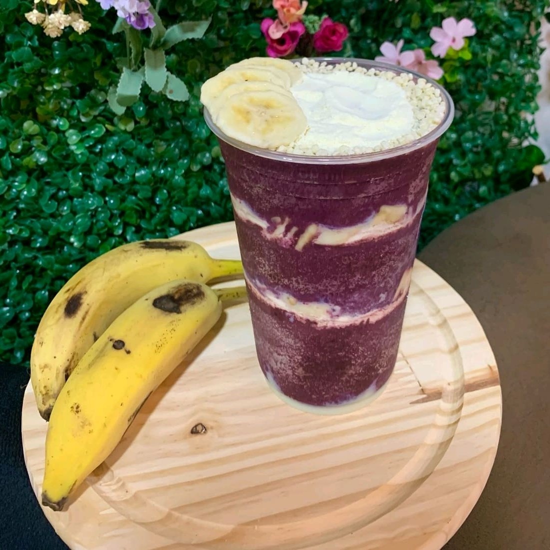 Na base temos uma camada de leite condensado, flocos de arroz, leite em pó e Banana, por cima uma generosa camada de açaí cremoso. O copo é composto por três camadas dessa delícia.