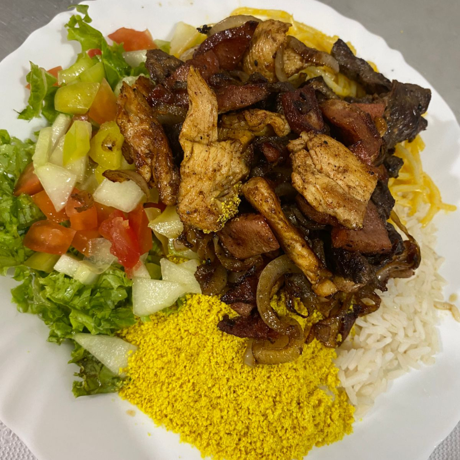 CARNE, FRANGO, CALABRESA, ARROZ, FAROFA, MACARRÃO, E SALADA