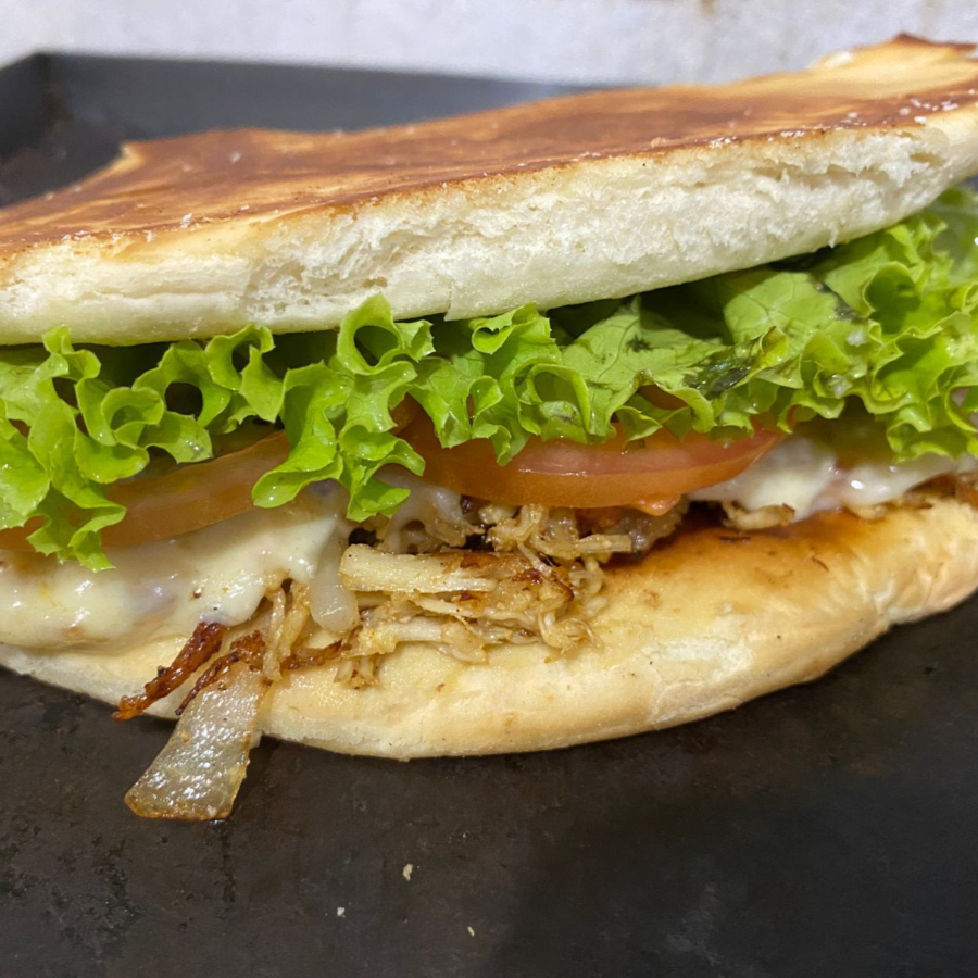 Frango desfiado, queijo, cebola, tomate, alface e batata palha.