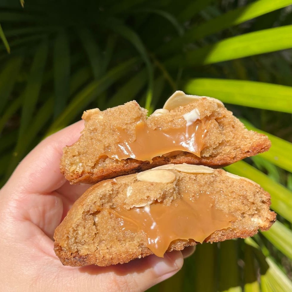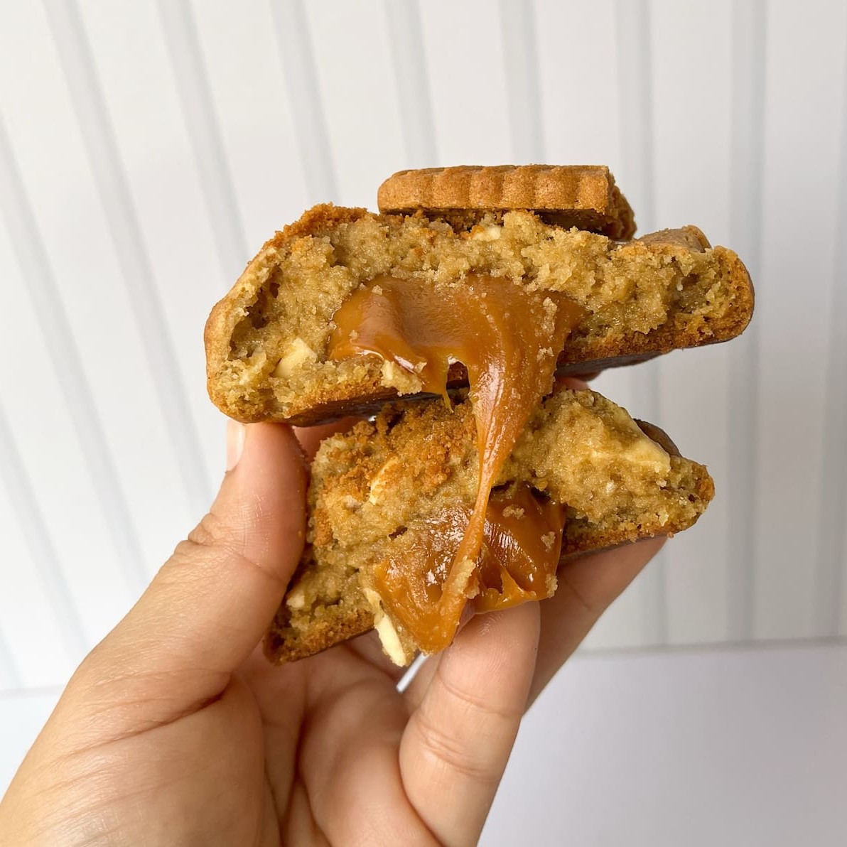 Massa tradicional, chocolate branco, caramelo salgado puxa puxa, crumble de Biscoff e finalizado com biscoito Biscoff.