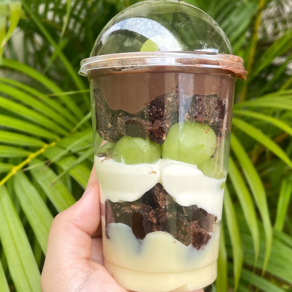 Brigadeiro de Ninho, brownie, mousse de Ninho, uva sem caroço e brigadeiro 50%.