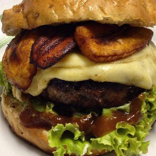 Pão bola, carne, queijo, banana, presunto, alface, tomate, batata palha