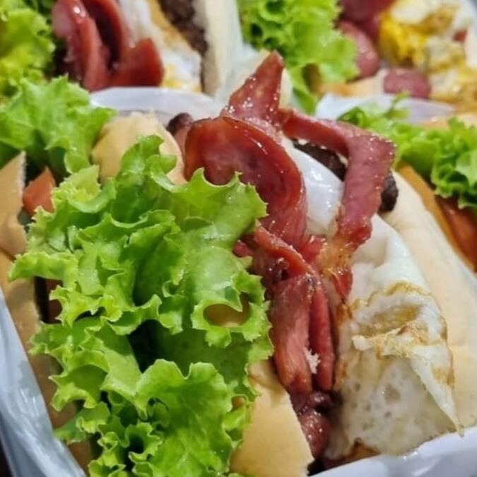 Pão bola, carne, ovo, alface, tomate e batata palha