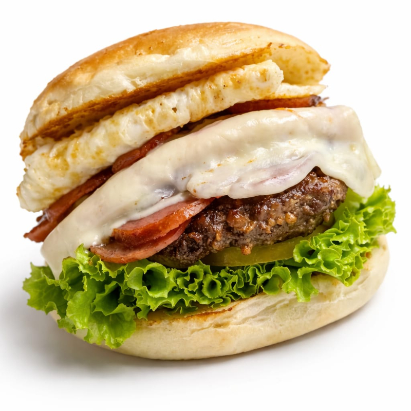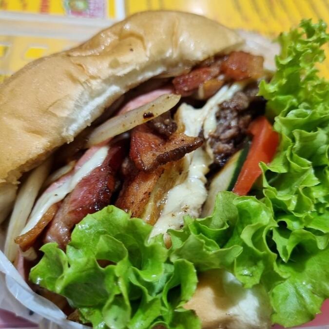 Pão bola, carne, ovo, queijo, presunto, calabresa, alface, tomate e batata palha.