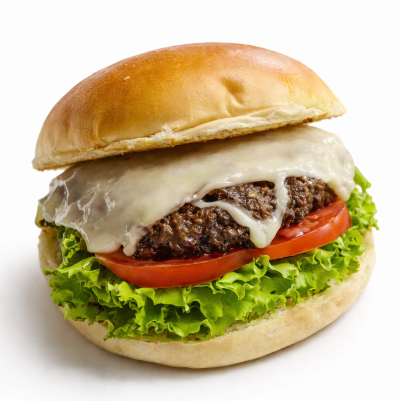 Pão bola, carne, queijo, presunto, alface, tomate e batata palha