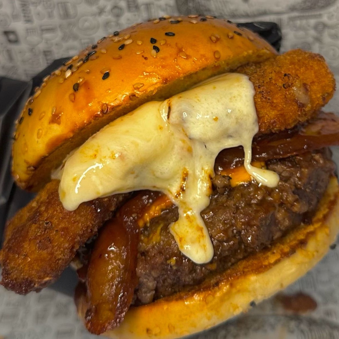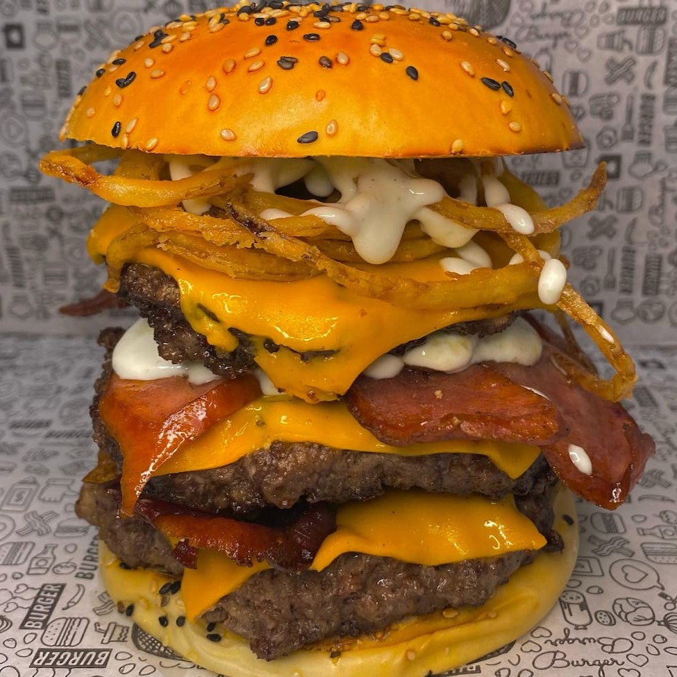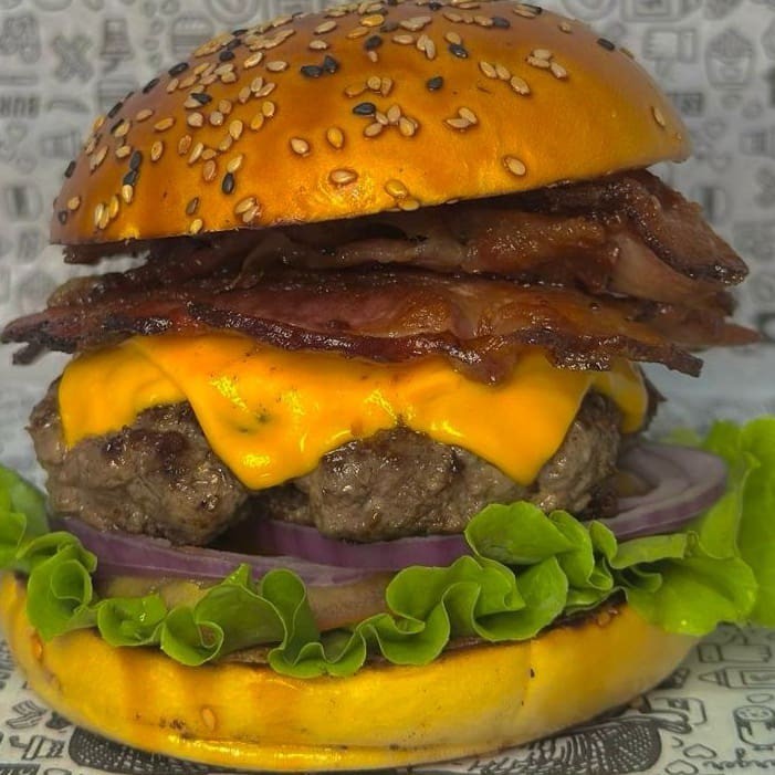 Pão brioche, 3 blends 130g, queijo prato, bacon, calabresa e cebola crispy